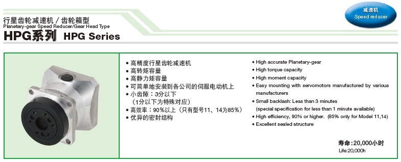 HPG行星齒輪減速機高精度行星齒輪減速機,可簡單的安裝到各公司的伺服電機上。 諧波發生器:橢圓形凸輪的外圈上嵌入薄型的滾珠軸承,整體呈一橢圓形狀的零件。軸承的內圈固定于凸輪之上,外圈則介由滾珠彈性變形。一般安裝在輸入軸上。 柔輪:具有薄壁杯型的金屬彈性體的零件。杯的開口部外圈刻有齒形。柔輪的底部稱為膜,通常安裝到輸出軸上。 剛輪:剛性環狀的零件。內側上刻有與柔輪同樣大小的齒形,且比柔輪多2個齒數。一般固定在外殼上。